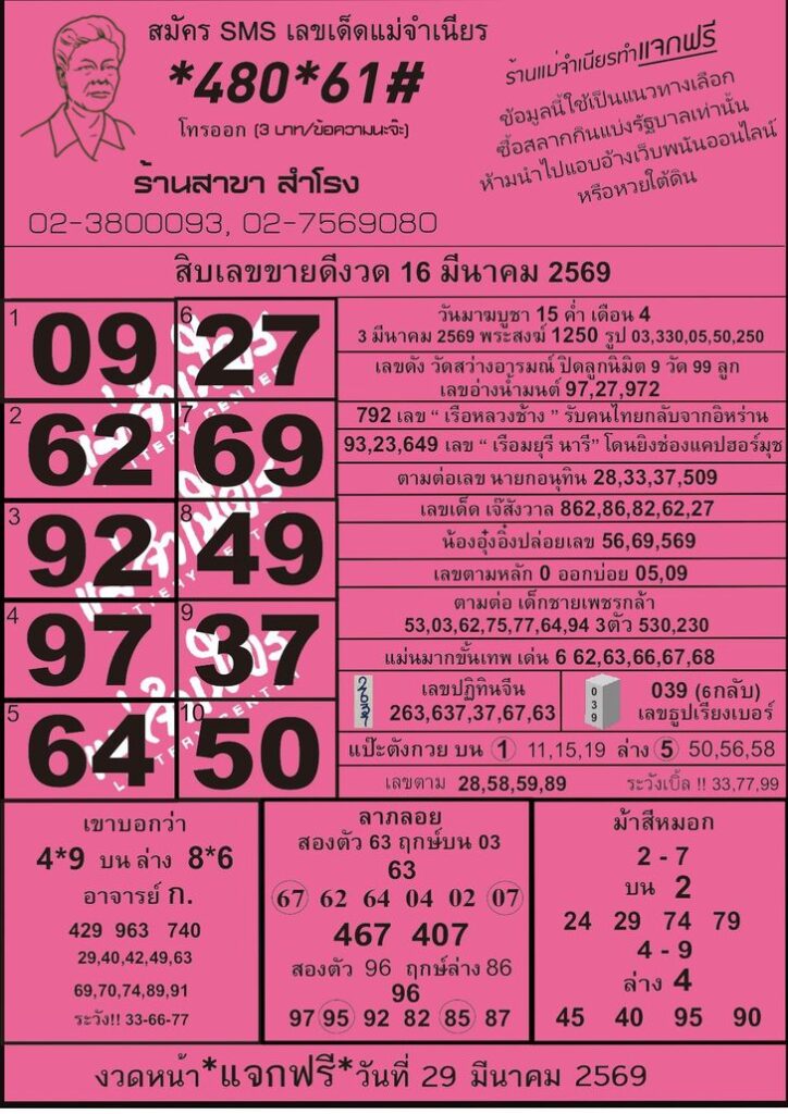 หวยแม่จำเนียร 10 อันดับเลขขายดี งวด 16 มี.ค. 2569 เลขมาแรงงวดนี้ รวมเลขดังหวยใบชมพู 16/3/69